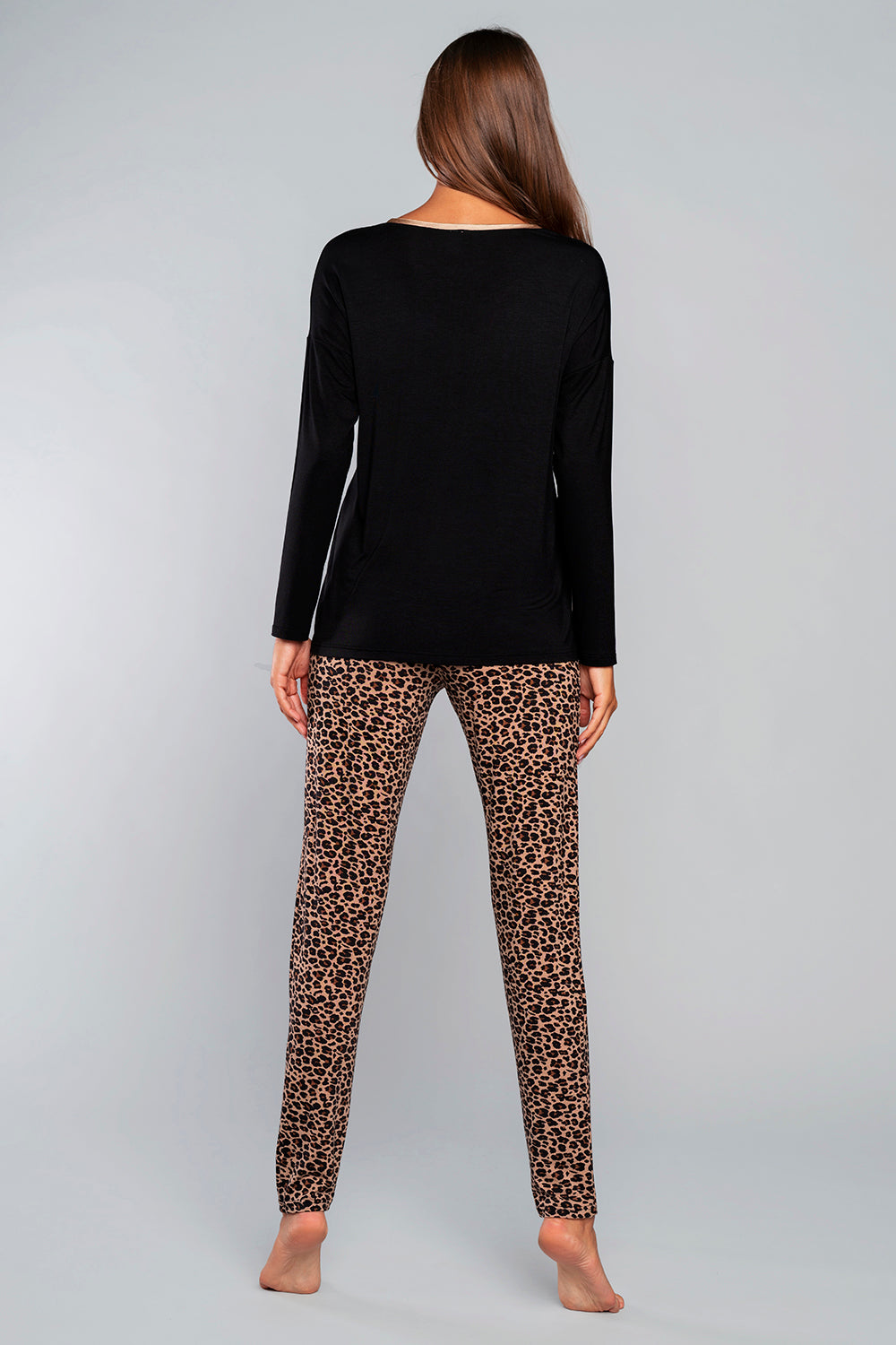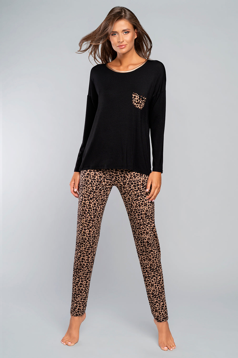 Style Eila pyjamas. - blouse with long sleeves - round neckline with satin trim - decorative pocket - long trousers with tapered leg - comfortable elastic waistband - fashionable leopard print pattern - pleasant to the touch knitted fabric